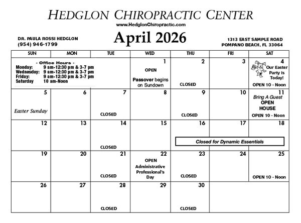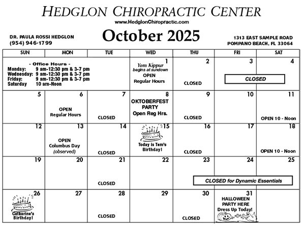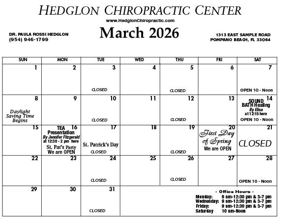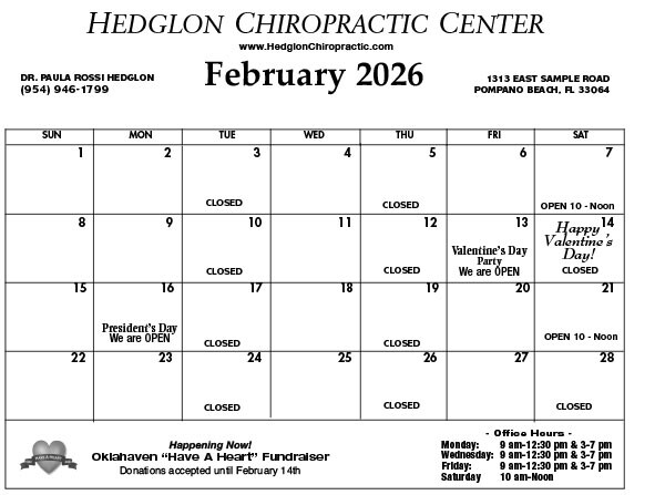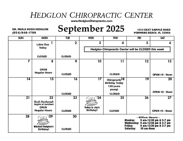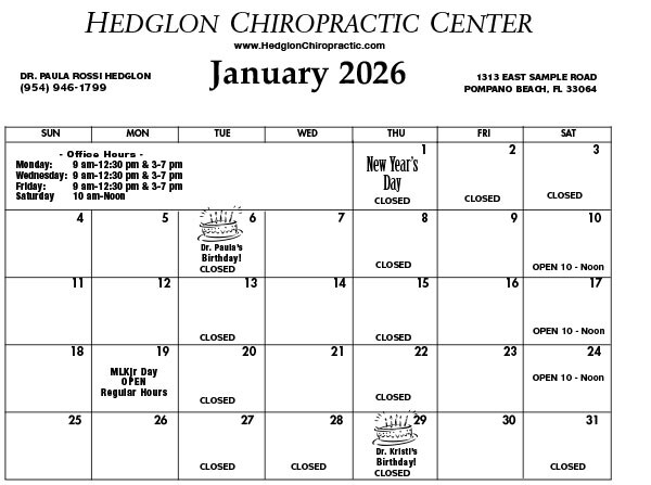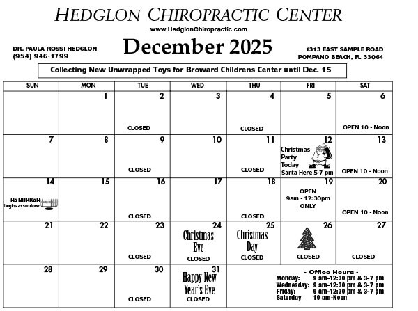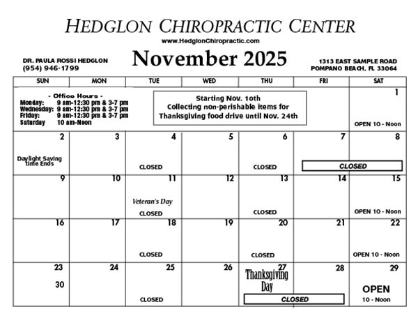 Hedglon Chiropractic Center is OPEN for regular hours on MONDAYS, WEDNESDAYS, FRIDAYS and SATURDAY mornings.